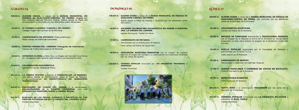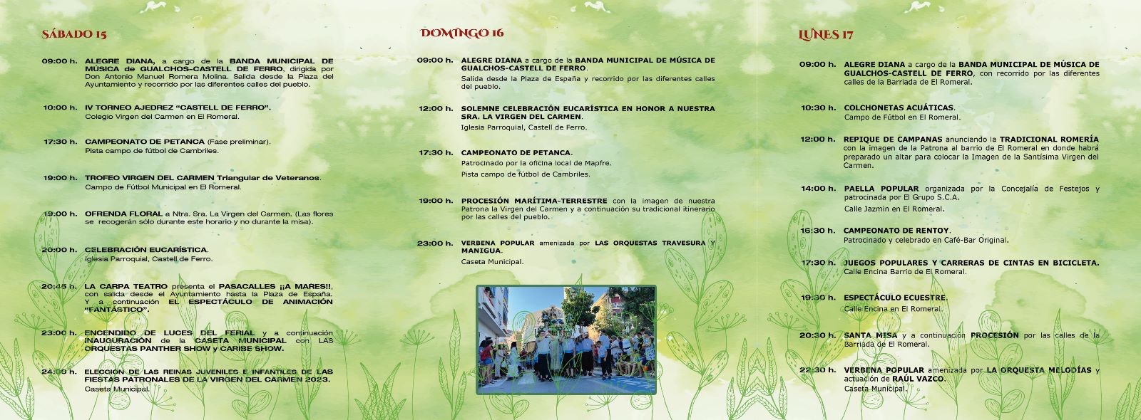 El encendido de luces del ferial será el sábado a las 23.00 horas, seguido de la inauguración de la caseta municipal (parking municipal, en la calle Carlos Cano). El domingo a las 19.00 horas será la procesión marítimo terrestre de la Virgen del Carmen, que procesionará también por las calles del pueblo. El lunes 17 está previsto el repique de campanas anunciando la tradicional romería con la imagen de la patrona al barrio de El Romeral, y el martes habrá un castillo de fuegos artificiales como fin de fiestas.