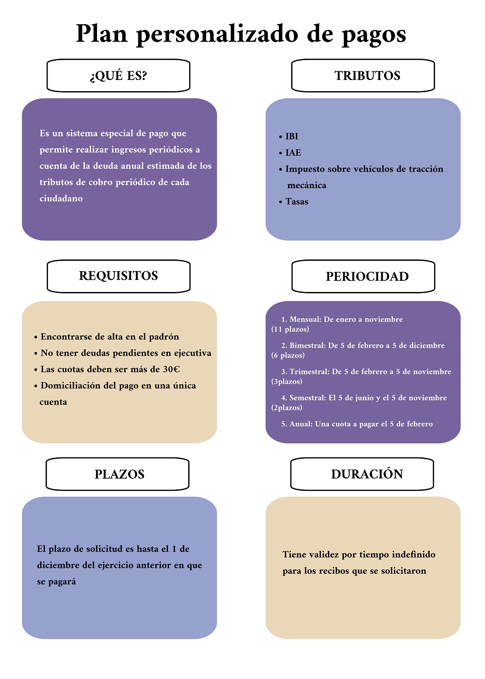 El ciudadano que así lo solicite se puede acoger al pago de todos sus impuestos de forma Mensual: de enero a noviembre (11 plazos); Bimensual, del 5 de febrero al 5 de diciembre (6 plazos); Trimestral, del 5 de febrero al 5 de diciembre (4 plazos); Semestral: del 5 de junio y 5 de noviembre (2 plazos) y anual: consistirá en una cuota única cuyo cobro se realizará el 5 de febrero.
