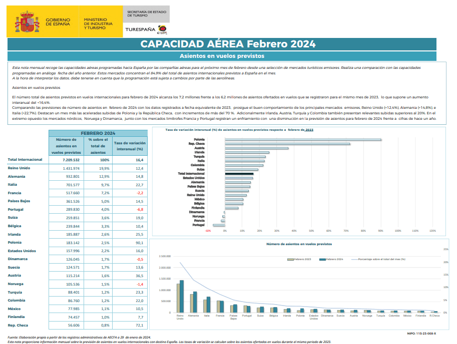 Comparando las previsiones de número de asientos en febrero de 2024 con los datos registrados a fecha equivalente de 2023, prosigue el buen comportamiento de los principales mercados emisores hacia España: Reino Unido (+12,4%), Alemania (+14,8%) e Italia (+22,7%).