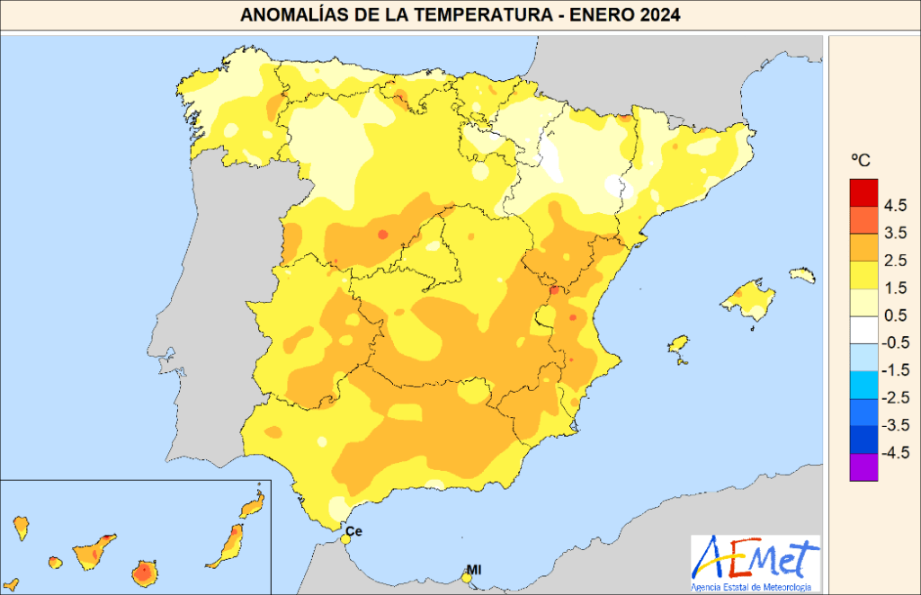 El mes de enero resultó extremadamente cálido en el sur y en el centro de la península, y cálido o muy cálido en el tercio norte, llegando a ser normal en algunos puntos del valle del Ebro. En Baleares fue muy cálido y en Canarias muy cálido o extremadamente cálido.