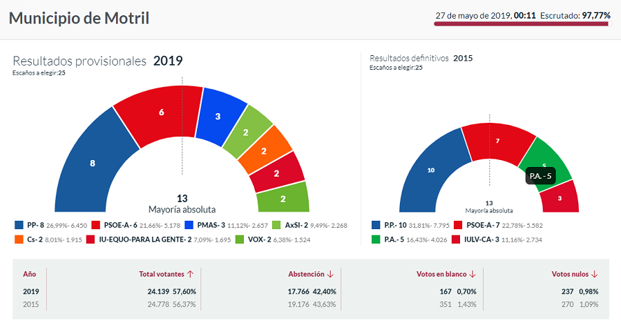 MOTRIL. El PSOE pierde 1 escaño, se queda con 6, y entran en el Ayuntamiento 3 partidos nuevos: AxSí con 2 escaños; Cs con 2 escaños; y Vox con 2 escaños. PMAS, con 3 Sigue leyendo