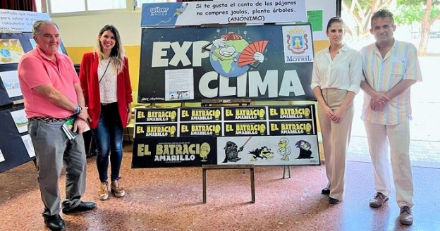 El segundo teniente de alcalde de Urbanismo, Medio Ambiente y Agricultura, Antonio Escámez, el director del “Batracio Amarillo”, Francisco Javier, la directora del CEIP Los Álamos, Rocío Torices Martín, y la responsable de marketing y comunicación de WIBER, Marisa Chacón han visitado hoy la exposición sobre el clima del “Batracio Amarillo”.