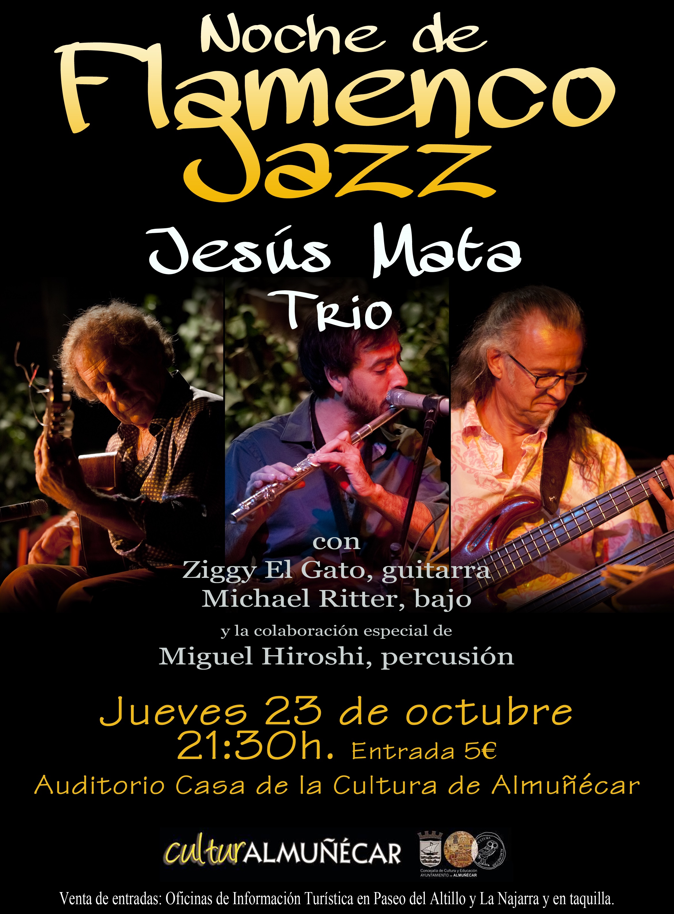 ALMUÑÉCAR. El grupo formado por Jesús Mata, al saxo y la flauta; Ziggy El Gato, a la guitarra; y Michael Ritter, al bajo, ofrecerá el próximo jueves 23 de octubre en La Casa de la Cultura de Almuñécar, un concierto en el que, fusionando el flamenco y el jazz, incluirán, además de composiciones propias, algunos de los más conocidos temas de ambos estilos, contando además con la colaboración de Miguel Hiroshi a la percusión para este evento. El concierto dará comienzo a las 21.30 horas y tendrá un precio de entrada de 5 €.