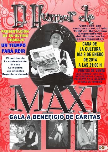 El humorista Maxi presenta su último trabajo bajo el título «Un tiempo para reír». Las entradas, al precio de 5 euros, se pueden adquirir en Electromar (calle Real), Natureco (Avda. Europa) y en la Oficina de Turismo, en el Palacete La Najarra.
