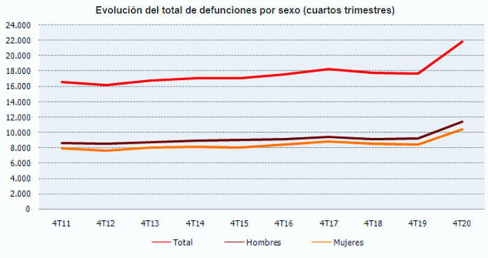 Registradas 21.890 defunciones en el 4º trimestre de 2020, un 23,9% más que en el mismo trimestre del año anterior