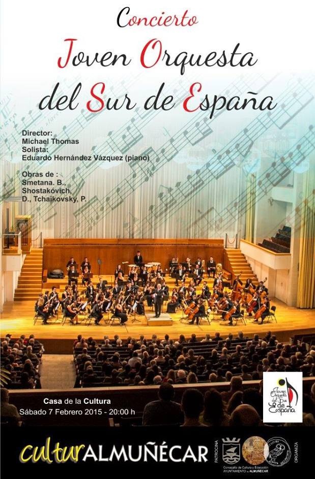 ALMUÑÉCAR. El auditorio de la Casa de la Cultura de Almuñécar acoge este sábado, desde las 20:00 horas, un concierto musical a cargo de la Joven Orquesta del Sur de España bajo la dirección de Michael Thomas y actuando como solista el pianista Eduardo Hernández Vázquez.