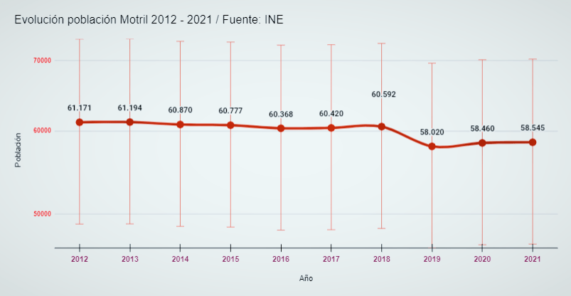 MOTRIL. Los datos publicados por el Instituto Nacional de Estadística (INE) revelan la pérdida de población empadronada, 2.626 habitantes (4,29%), en el municipio en la última década, de 2012 a 2021.